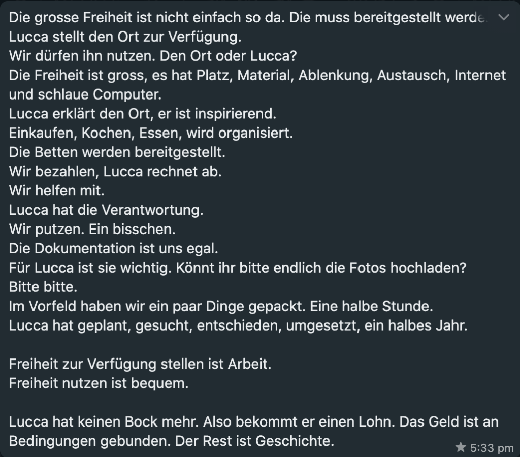 Da das Haus von so einem Projekt fast intensiver genutzt wird, als für Ferien, müsste in Zukunft aber wohl etwas mehr als nur 400 CHF pro Woche fürs Haus bezahlt werden und auch im Allgemeinen würde ein kleines Budget für gewisse Anschaffungen dem Projekt sicher guttun. Die grösste Ausgabe wären aber vor allem Löhne, da ich in Zukunft kaum bereit sein werde, so viel gratis Arbeit zu leisten und auch von den Menschen, die mich dabei unterstützen würden, möchte ich nicht verlangen müssen, dies ohne finanzielle Entschädigung zu tun. Das Projekt hätte sicher gewisse Chancen von Kulturgeldern unterstützt zu werden. Aber hier stellt sich wieder die Frage, was für eine Abhängigkeit das mit sich bringen würde. Simon hat das gut auf den Punkt gebracht.